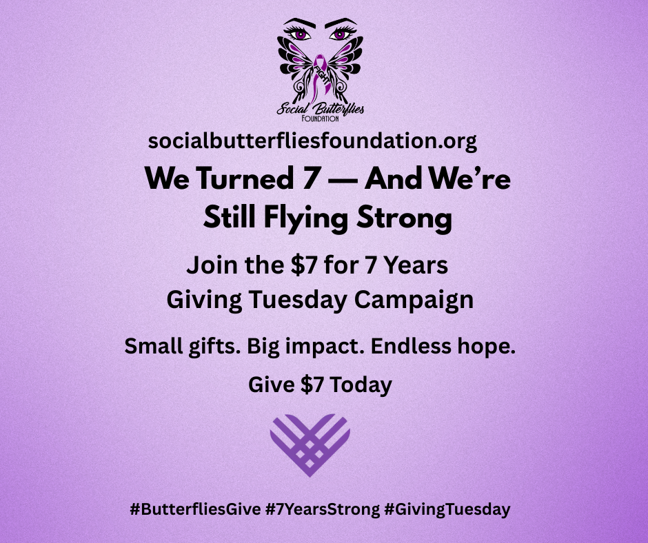 We turned 7 on October 5th — and we’re just getting started! For 7 years, Social Butterflies Foundation has spread love, hope, and direct support to lupus & fibromyalgia thrivers and their families. Now, we’re celebrating with our $7 for 7 Years Campaign as we head into Giving Tuesday!