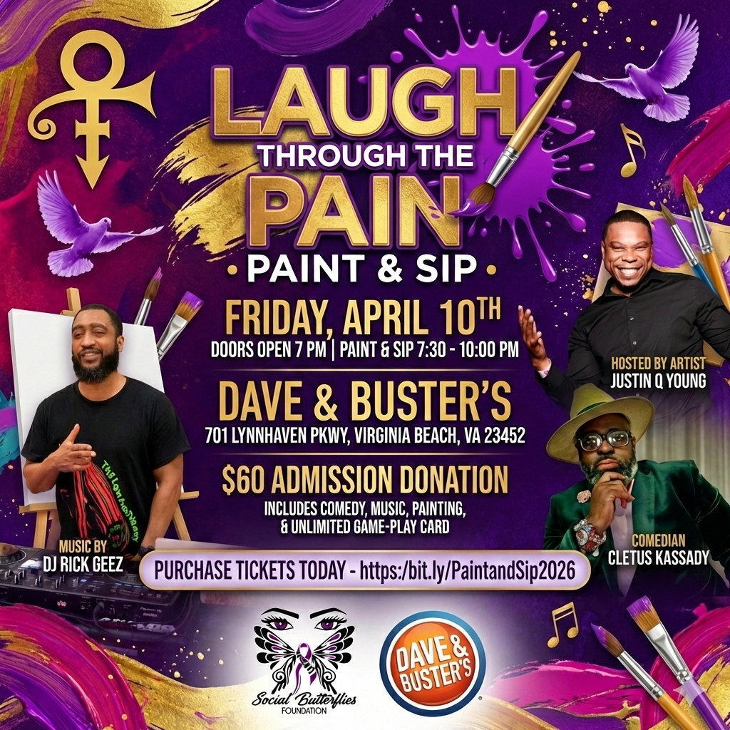 Experience Laugh Through the Pain Paint & Sip, a Prince-inspired evening of creativity, laughter, music, and healing. This elevated Paint & Sip experience combines guided painting, comedy, music, and unlimited game play in a fun, high-energy atmosphere at Dave & Buster’s in Virginia Beach.