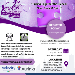Social Butterflies Foundation and Parents Against Bullying cordially invite lupus and fibromyalgia survivors, caregivers, the medical community, and others affected by chronic illnesses to join us for a day devoted to health and wellness. The Lupus & Fibromyalgia Summit and Health Fair provide a variety of discussions led by physicians and other experts dedicated to...